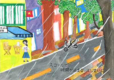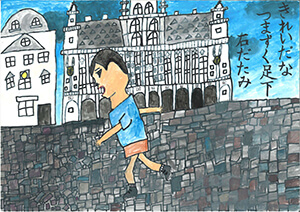 In the contest held under the theme of “town,” there were many exotic works submitted from Japanese schools overseas. All entries showed how proud they are of the cities where they reside. The poems featured magnificent towers and buildings, urban transportation, bustling markets, colorful roof tiles and cobblestones. Some of the poems are about deserted towns due to the Corona virus.