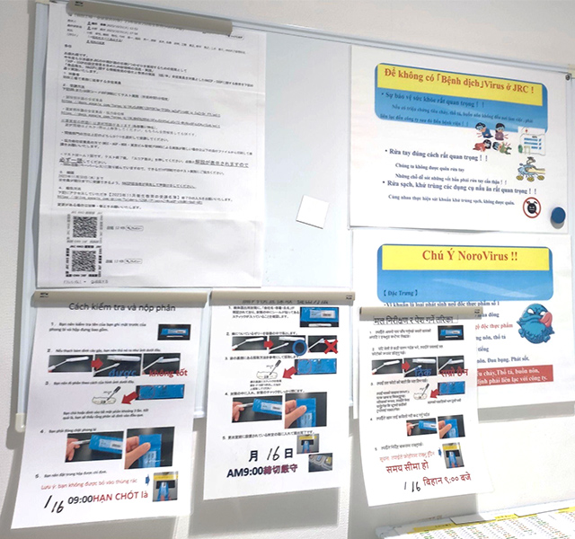 その後、エアシャワーと粘着ローラーで埃を取り、また手洗いをするなどの衛生確保作業が、定められた時間行われるよう決められている。さらに、従業員の保持菌検査として、定期的に腸内検査などが実施されている。工場には多くの海外出身の従業員さんもいるため、きちんと各国の言語の案内も掲示されている。