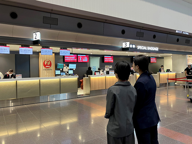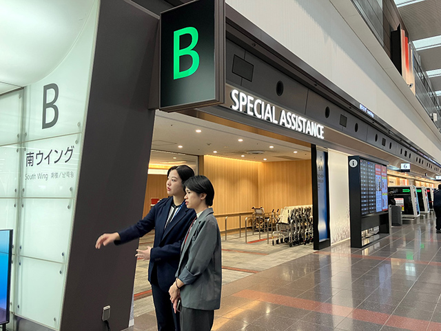 全てのお客さまに最高のサービスを提供するため、スペシャルアシスタンスカウンターと呼ばれる特別なサポート・エリアを設けている。ここでは、チェックイン手続きの他、お子さま連れのお客さまや、お手伝いが必要なお身体の不自由な方の要望にも対応している。障がい者用に用意された車いすは、セキュリティゲートで金属探知にかからないよう木製となっており、全てのお客さまにサービスを提供するJALのきめ細かな配慮が感じられる。