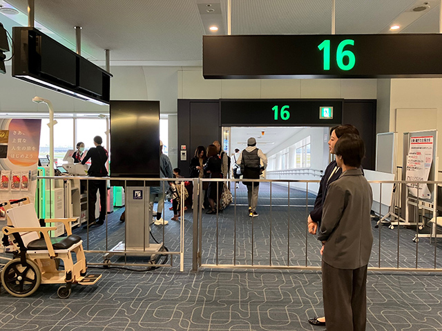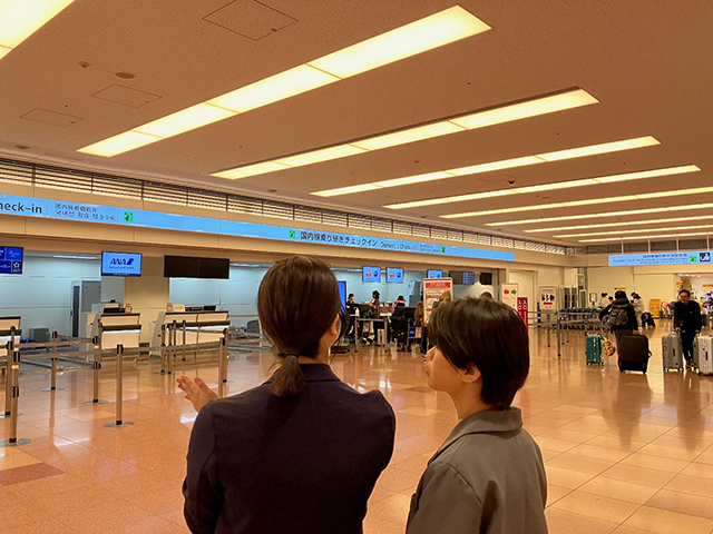 その後、国内線の搭乗ゲートを見学することになった。ここでは係員が全ての情報を確認し、機内で待機している客室乗務員に報告し、全てのお客さまが搭乗を完了したことを確認する必要がある。今回は搭乗客としてではなく見学者として、チェックインからドアが閉まり飛行機が動き出すまでを見学することができ、思い出深い体験となった。
